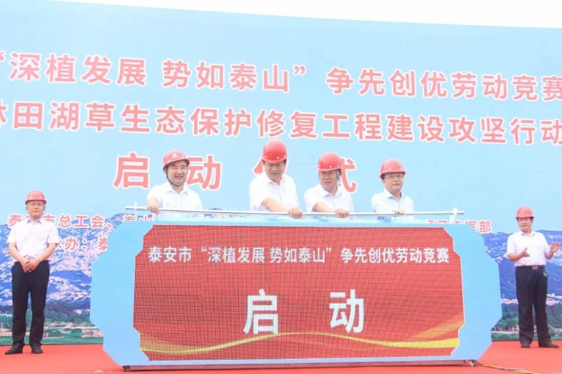 在啟動儀式上,泰山區域山水林田湖草生態保護修復工程領導小組辦公室常務副主任劉培亭首先介紹了泰山區域山水林田湖草生態修復工程項目推進情況。隨后,市總工會黨組書記、常務副主席郭青進行了賽前動員。參加儀式的領導共同為9勞動競賽先鋒隊代表進行授旗。中國鐵工旗下中鐵(泰安)環境治理公司黨委書記、總經理徐松苗代表參建單位和參建職工發出了倡議。最后,泰安市委常委、市委統戰部部長張紅旗,市人大常委會黨組副書記、副主任、市總工會主席張書盈,集團公司黨委副書記、工會主席年福兵,泰山區區委書記趙斌共同推動活動啟動桿,正式拉開了勞動競賽的序幕。