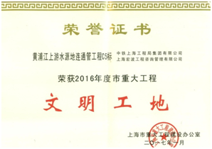 近日,從上海市重大工程建設辦公室傳來佳訊,由公司承建的上海黃浦江上游水源地連通管工程C5標項目榮獲上海市“2016年度重大工程文明工地”稱號,為公司再添榮譽。